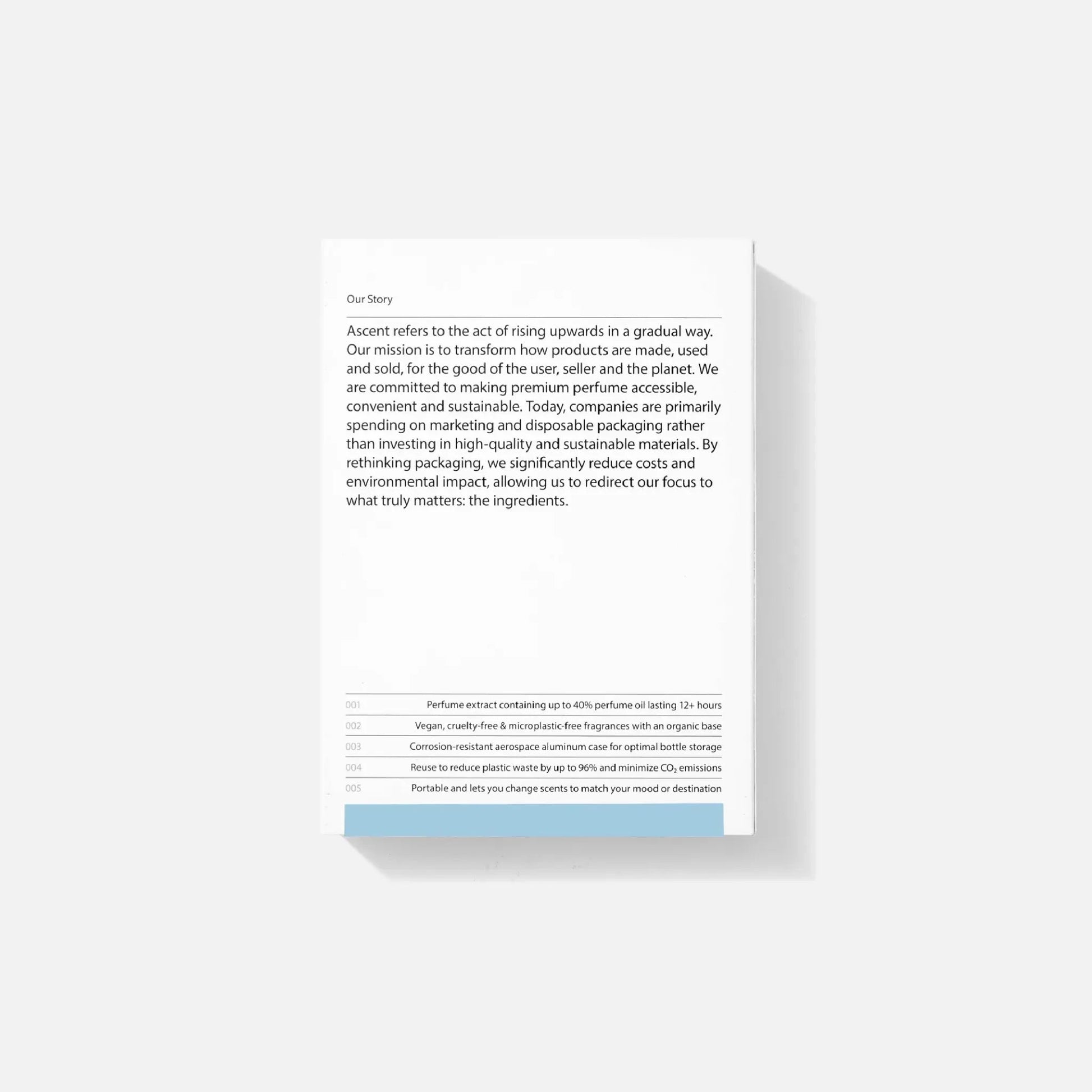 Ascent Blue perfume extract is an evocative perfume that blends smoky, sensual notes with woody and powdery accords, boasting 38% perfume oil for lasting 12+ hours. While suitable for year-round wear, its scent profile particularly shines during the fall season. It is vegan, cruelty-free, and made with an organic base. Our fragrances are gender-free, created to be worn and loved by all.
