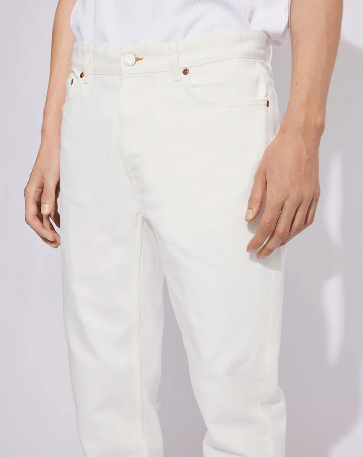 Ben is a pair of loose-fitted jeans with a mid-waist, button fly, and a cropped, tapered leg.