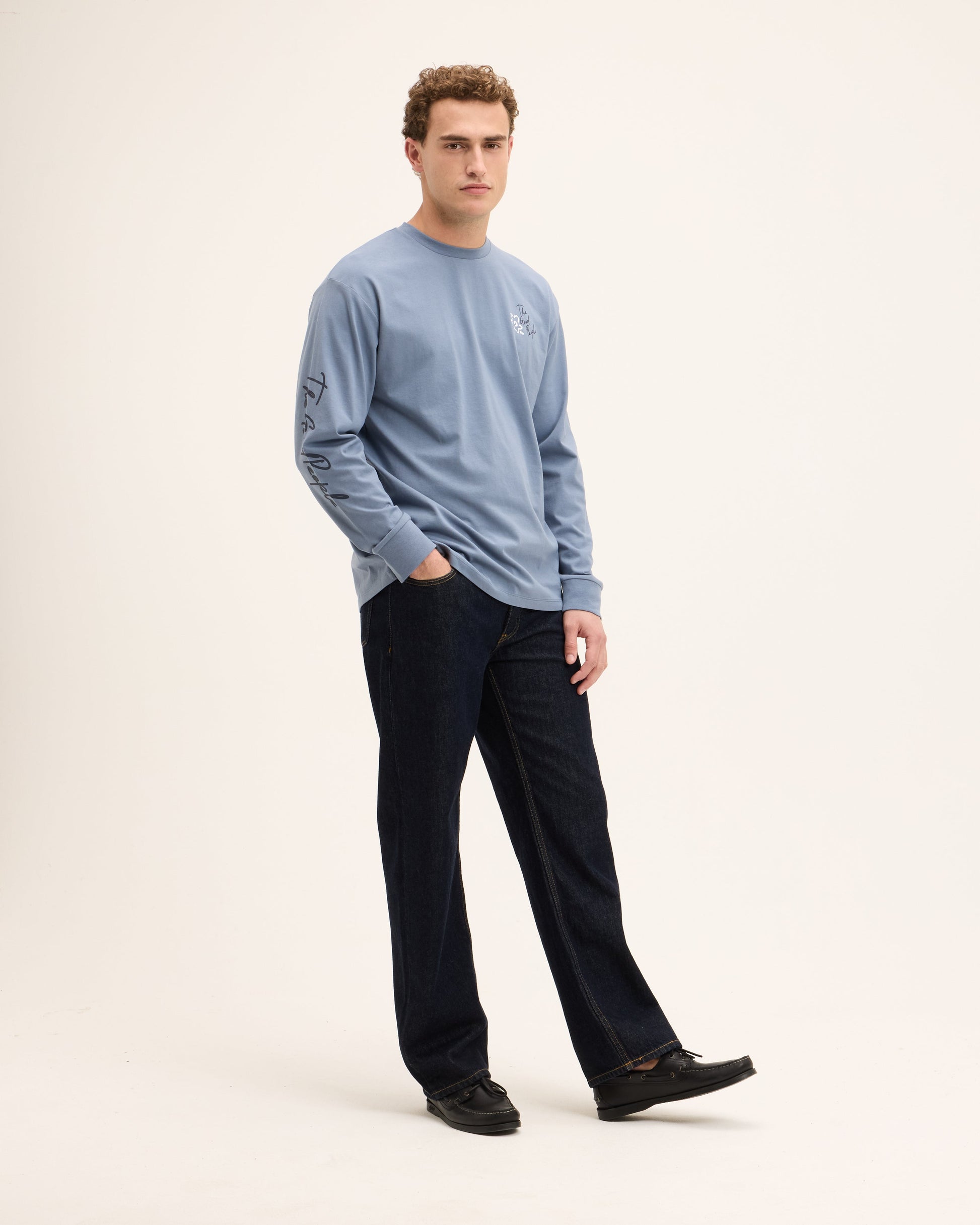 The Oliver Artwork Longsleeve features a subtle chest print and a handwritten artwork along the sleeve. The details are subtle and don't overpower the design. It is made from 100% Cotton.