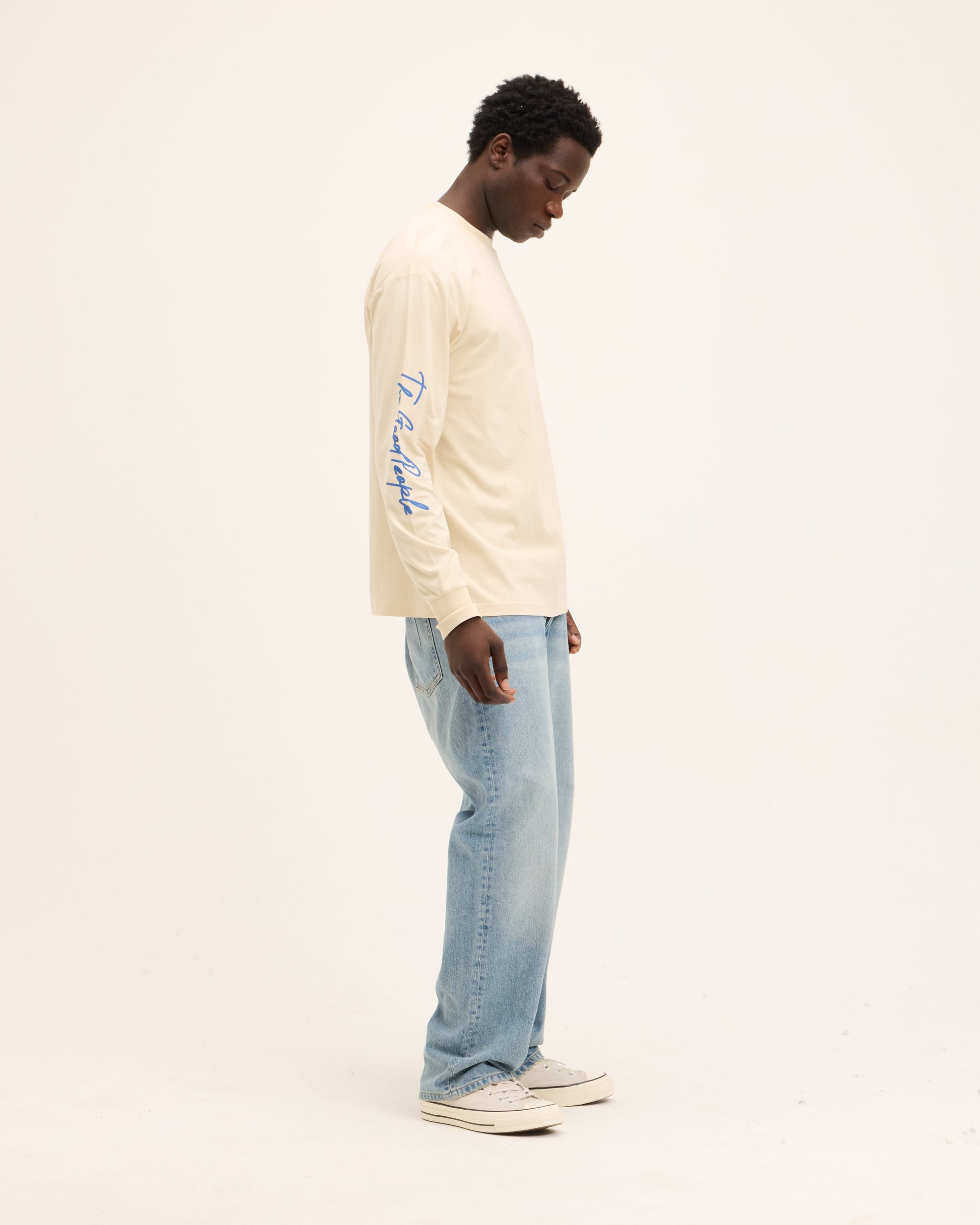 The Oliver Artwork Longsleeve features a subtle chest print and a handwritten artwork along the sleeve. The details are subtle and don't overpower the design. It is made from 100% Cotton.