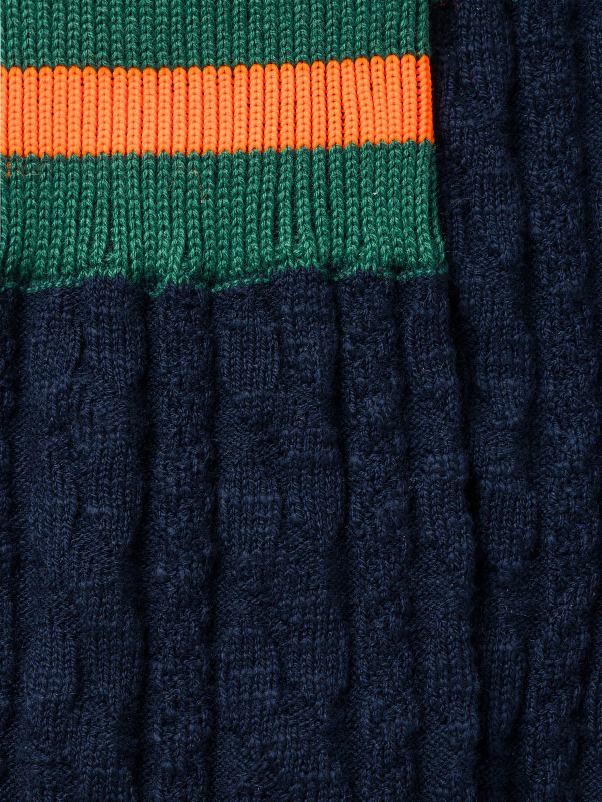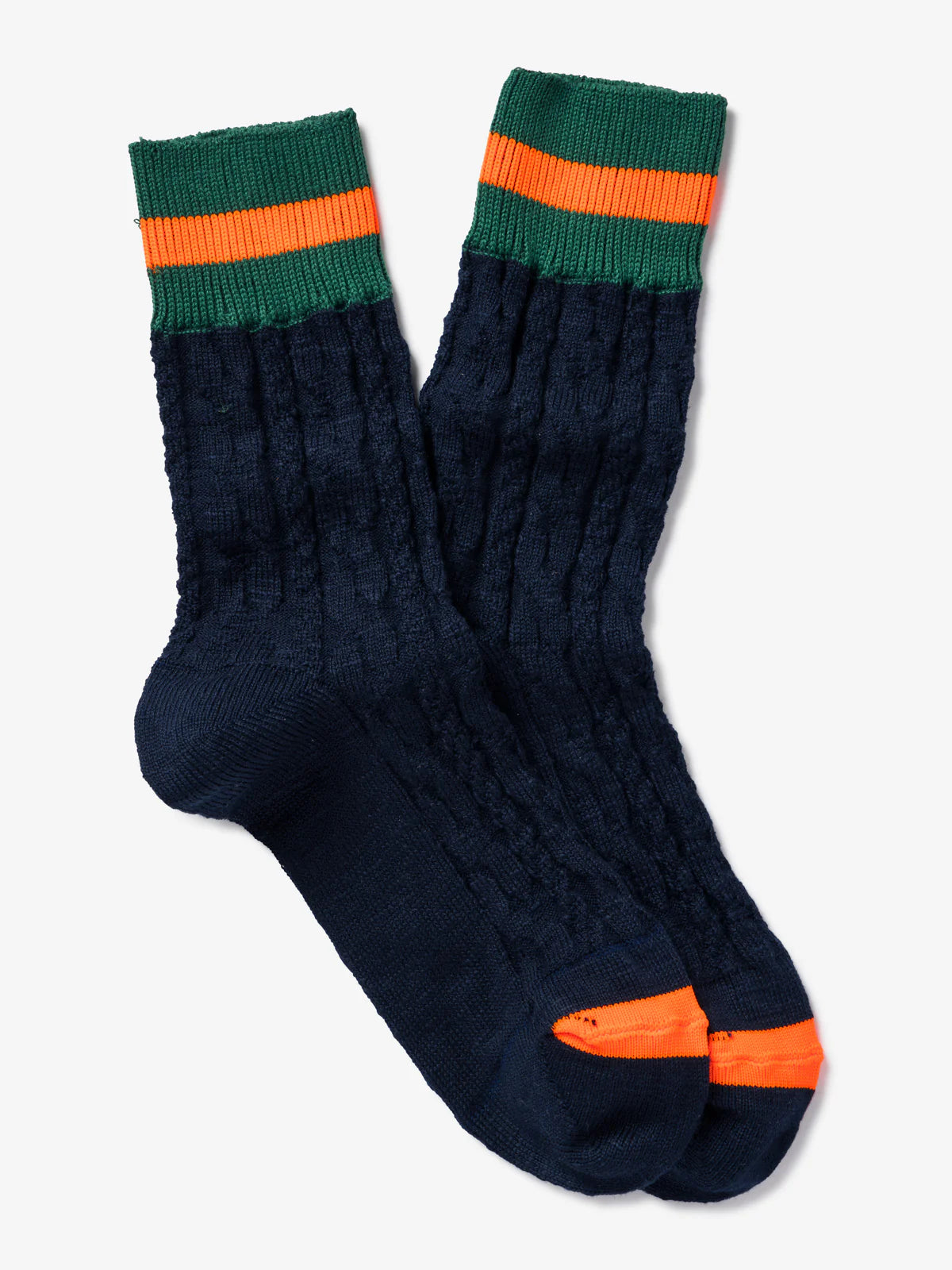 The chic and casual socks. This cable style is a variation of cricket sweaters, in socks. A fluorescent stripe adds a touch of freshness.