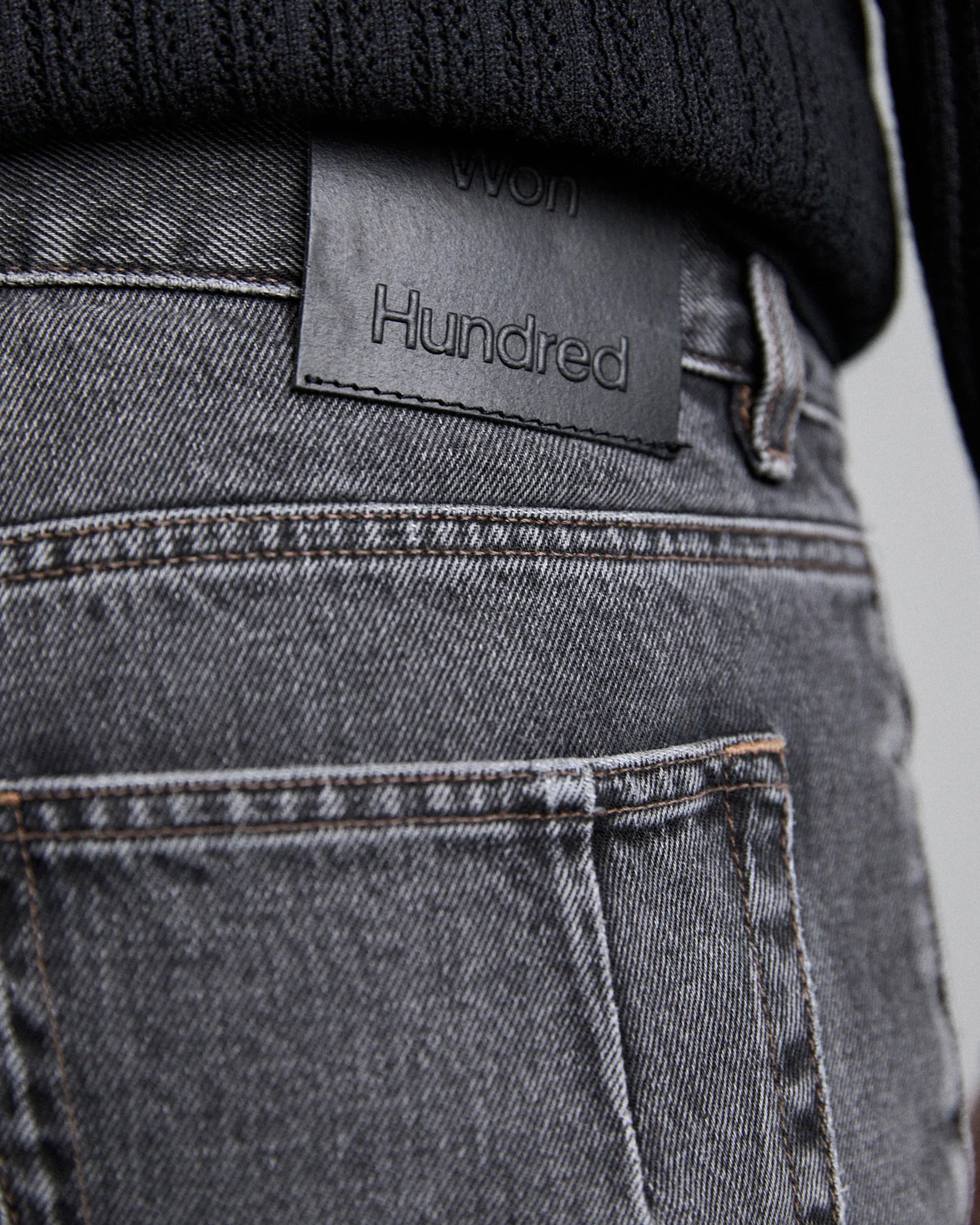 Features branded logo buttons, rivets, and leather labels, as well as the Wun Hundred signature dart at the back pockets.