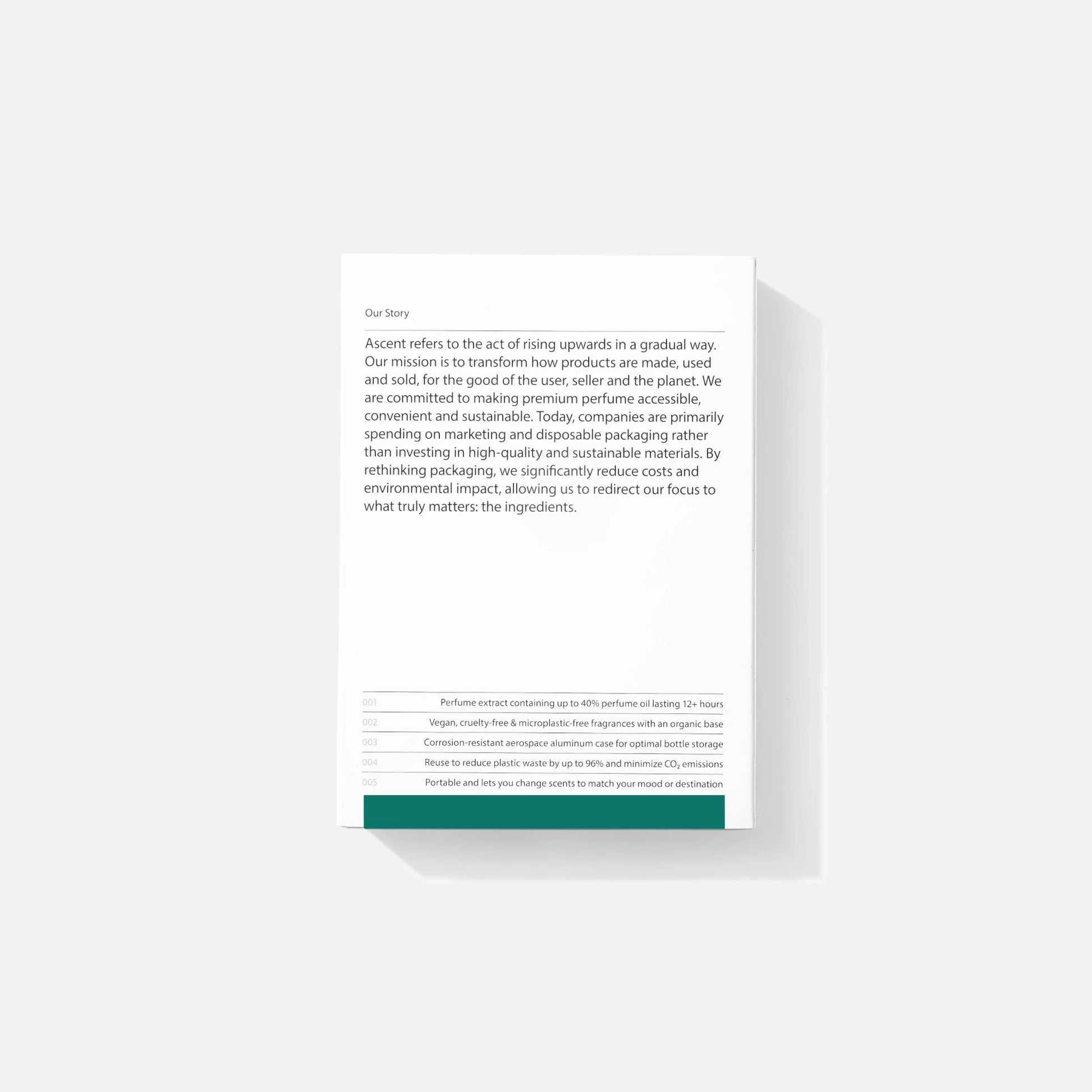 Ascent Teal perfume extract is a bold and spicy fragrance with warm and woody notes, intertwined with the rich, earthy scent of tobacco. Its complexity is balanced by hints of sweet vanilla and a touch of leather, creating an intriguing and masculine aroma that lingers. With 37% perfume oil, it lasts 12+ hours. The fragrances are gender-free, created to be worn and loved by all.